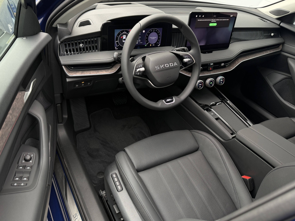 vyhřívaná a automaticky odclonitelná u řidiče, Elektronická parkovací brzda s funkcí Auto Hold, Elektrické ovládání oken vpředu a vzadu, Středová konzola s držákem nápojů a schránkou na brýle, 12V zásuvka ve středové konzoli, 5x USB-C - 2x vpředu (45 W), 2x vzadu (45 W) 1x u vnitřního zp. zrcátka (15 W), Schránka u řidiče, Deštník ve dveřích řidiče, Držák na parkovací lístky za čelním sklem, Schránka u spolujezdce, Nastavitelná loketní opěrka vzadu s držákem nápojů, Kapsy na telefon pro cestující vzadu, Zadní sedadla dělená v poměru 60:40, sklopná ze zavazad. Prostoru, Zavazadlový prostor s cargo elementy, 4x sklopné háčky v zavazdlovém prostoru, 12V zásuvka v zavazadlovém prostoru, Roletový kryt zavazadlového prostoru (kombi), Sada na opravu pneumatik, Škrabka na led ve víku palivové nádrže, Příprava pro tažné zařízení, Komfortní sedadla vpředu - výška, posuv a hloubka ručně nastavitelné - sklon opěradla a bederní opěrka el. nastavitelné - masážní funkce se 3 vzduchovými vaky, Vyhřívání předních sedadel, Třízónový Climatronic, Tónovaná skla a Sunset, Multifunkční kožený volant, Multifunkční panel s otočnými ovladači (Smart Dials), Infotainment Media 10" - 8 reproduktorů, bluetooth, DAB, hlasové ovládání, příprava pro navigaci, bezdrátový SmartLink, Bezdrátové nabíjení telefonu (15W), Tísňové volání, Příprava pro služby ŠKODA Connect M